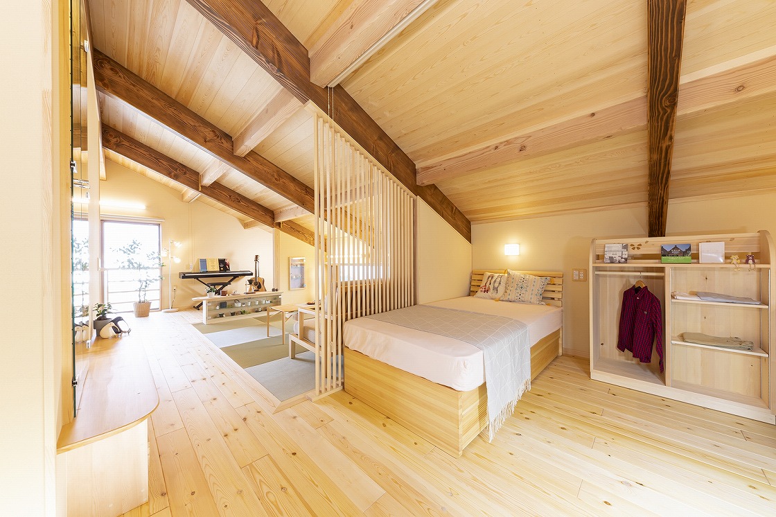 木の平屋は、小屋裏空間まで暮らしのスペースと考えています。三角の小屋裏空間は、一般的に「夏は熱く、冬はジメジメする」と言われていますが、木の平屋はそんな事ありません。1階から見上げると屋根の形に沿った木の大空間。屋根に反射して、小屋裏から子どもたちの遊ぶ声が聞こえてきます。それでいてここは、夏は涼しく、冬は暖かい。くらら工房は、デザイン性と機能性を両面兼ね備え、心地の良い空間をつくるために、屋根パネルを選びました。