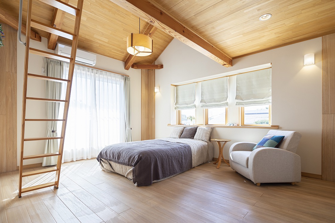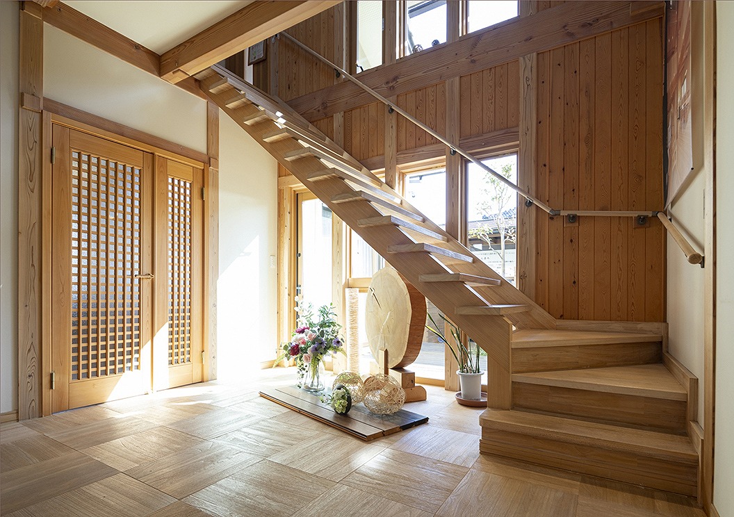木肌の美しさ、温もりは天然木だけの魅力。裸足で歩くとわかる、無垢の心地よさと暖かさ。木の香りに囲まれて、家の中にいながらまるで森林浴のよう。床板には無垢の赤松や桐などを使用。壁・天井には珪藻土などの天然素材の環境クロスを、収納や建具は杉や桐などの無垢材で造作するなど、心地よい暮らしのために一切妥協しない家づくりを行っています。